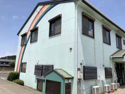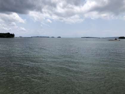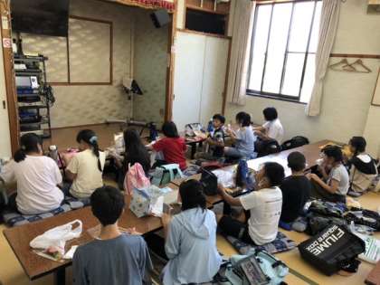昼食の時間です。思ったより日差しが強いので、休憩も含めて涼しい室内で食べました。5年生が宿泊する宿と、目の前の海の景色です。この後は、漁協の方の話を聞きます。