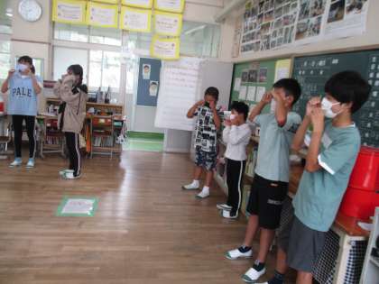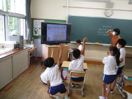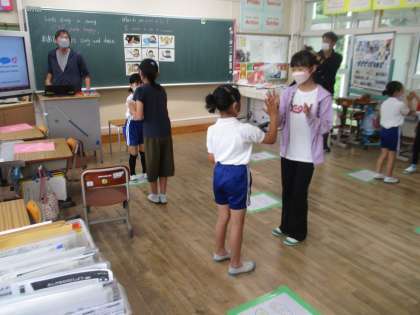 朝のEタイムの様子です。2年生と6年生はペアで楽しく活動していました。3年生はデジタル教科書を使ってミッシングゲーム(隠れた数字を英語で答える)に挑戦していました。