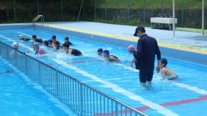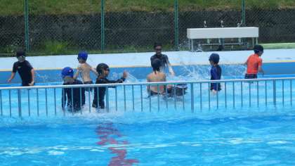 水泳学習の様子です。3年ぶりのプールで、みんなとても嬉しそうにしています。水に慣れてきたら、少しずつ泳ぐ練習も取り入れていきます。