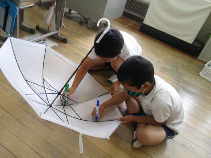 学校の畑で育てているトマトの雨除けのため、3年生が白いビニル傘に、トマトの絵を描いたり、好きな色を塗ったりしました。カラフルな雨除け傘で、トマトを守れるといいですね。