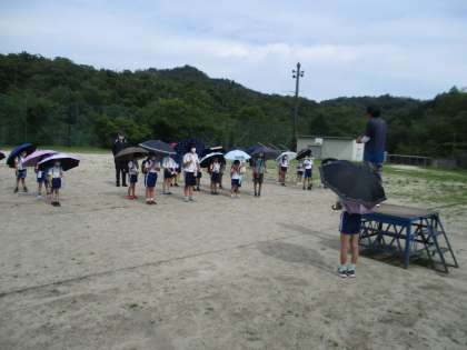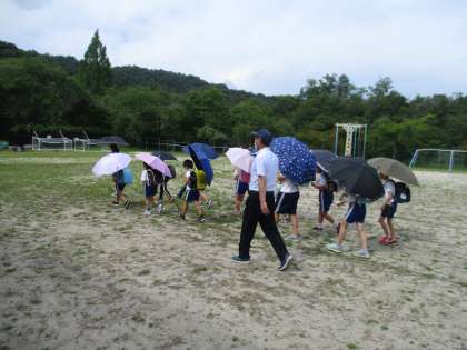 一斉下校時に、子ども達に「傘をさしてマスクを外して帰りましょう」「休みながら水分補給しながら帰りましょう」「体調が悪いときは、すぐに友達に知らせましょう」という声かけをしました。今後も暑い日が続きそうですので、睡眠をしっかり取ることや朝食をしっかり取るなどを含め、ご家庭でも引き続き熱中症対策へのご協力をよろしくお願いします。