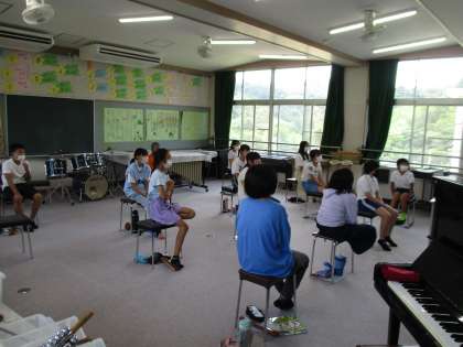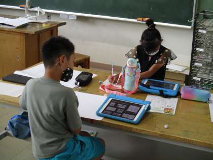 3年生の図工の授業と、5・6年生の音楽の授業の様子です。3年生は、学習用タブレットで調べたり、自分たちで育てた野菜を見たりしながら絵を描いていました。5・6年生は、デジタル教科書の映像を見ながらリズムを合わせるやり方を勉強していました。
