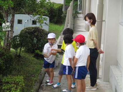 夏休みに入るということで、1年生が教室で飼っていたトカゲ等とさようならしました。「さようなら」「元気でね」など、声をかけながら草むらに逃がしてあげていました。生き物の飼育を通して、子どもたちは命の大切さなどを学んでいます。