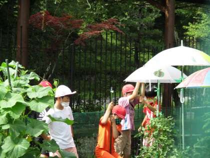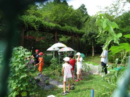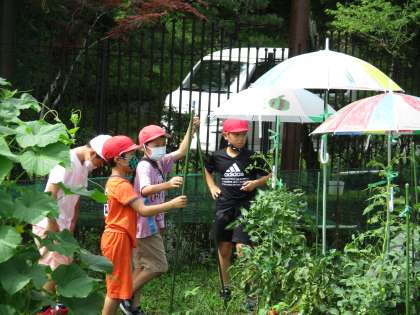 3年生は、学校の畑で野菜を栽培しています。これまでに、キュウリやナスやトマトなど、たくさんの野菜を育て収穫しました。子どもたちは「夏休み中もお世話する」とはりきっています。お店で売っている野菜に負けないぐらい、立派でおいしそうな野菜が育っています。