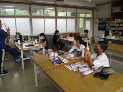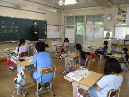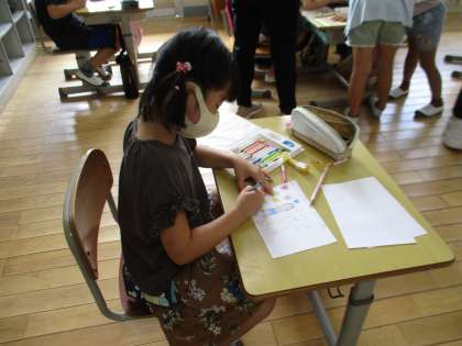 授業の様子の続きです。1・2年生は地域のお年寄りへのお祝いの手紙を書いていました。5年生はALTとの外国語学習、6年生は図工で光を取り入れる作品作りに取り組んでいました。