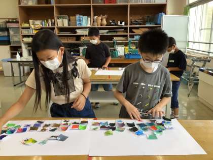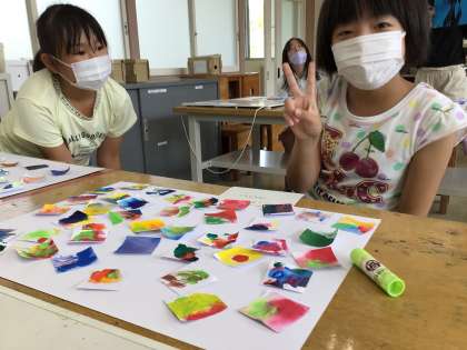4年生の図工の授業の様子です。初めに、前回各自で色を混ぜ合わせて作った紙を好きなように並べて作品を作りました。次に、隣の子が作った作品を見て色合いを楽しむとともに、好きなように並べ替えて違う作品を作りました。次に、隣の子と協力して2人で1つの作品を作りました。最後に、全員で1つの作品を作りかけて、今日の授業は終わりました。次回、どんな作品ができあがるか楽しみです。