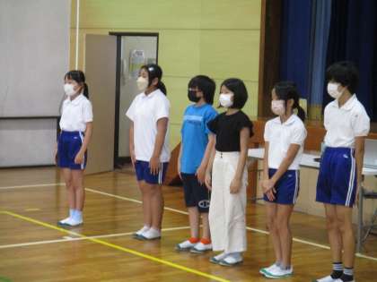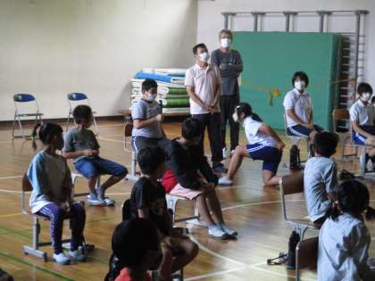 あいち健康の森健康科学総合センターから講師の方をお招きして、「正しい姿勢で健康な体を保とう〜よい姿勢でハッピーライフ〜」という内容で第1回学校保健委員会を開催しました。前半は、委員会の子どもたちによるクイズや説明がありました。時間がない中、健康いきいき委員会の子どもたちが準備や練習を頑張ってくれたおかげで、姿勢のことについてみんな楽しく学ぶことができました。