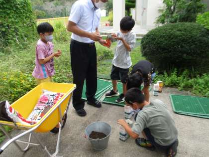 3年生が、これから収穫を目指す野菜の種まきをしました。土と肥料を混ぜたものを牛乳パックの中に入れ、自分が育てたい野菜の種をまいて土をかぶせ、水やりをしました。これからの成長が楽しみですね。