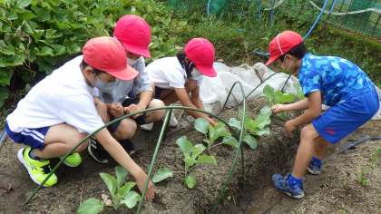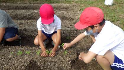 3年生は総合的な学習の時間で野菜作りをしています。今日は、いつも野菜作りでお世話になっている地域の方に教えていただきながら、新しい野菜を植える活動をしました。これまで学習を積み重ねてきた経験を生かし、3年生の子どもたちは慣れた手つきでどんどん野菜を植えていました。収穫できる日を楽しみに、これから毎日水やりをしたり観察をしたりしていきます。