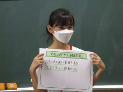 6年生が「がん教育」の授業に取り組みました。クイズ形式でがんについて学んだ後、自分が考えた「がん予防宣言」を全員が発表しました。最後は、学習用タブレットを使って学習の振り返りをしました。宣言で書いたことを、これからの生活に取り入れていってほしいと思います。