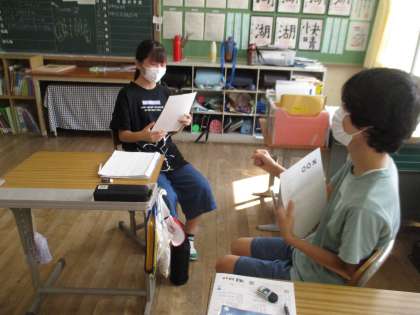 6年生英語の授業の様子です。今日は、英語で「2Trues1Lie(2つの真実と1つのうそ)」というゲームをしました。子どもたちは、先週の週末に出かけた場所や食べた物などを英語にしてペアで出題し合いました。「I ate susi.」など、習った英語を使って上手に会話ができていました。英語が使えると、外国の人とも気軽に会話ができていいですね。