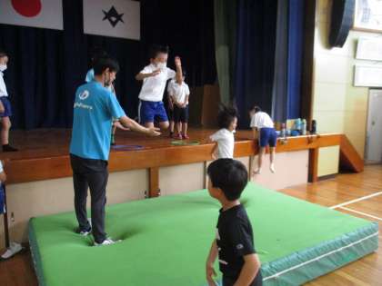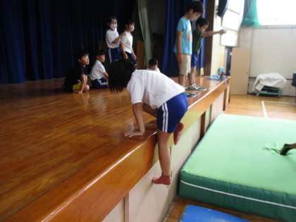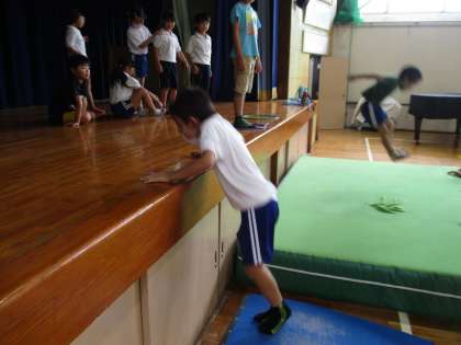 1・2年生の体育の授業の様子です。今日は大型マットを使ってジャンプの練習をしていました。ジャンプした後は、ロイター板と手の力を使って上に上がる練習もしていました。