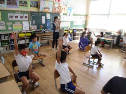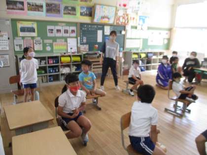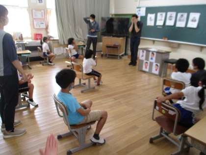 1・2年生の英語の学習の様子です。ALTと一緒に、英語で示された動きをジェスチャーでするという活動をしていました。みんなとても楽しそうに取り組んでいました。