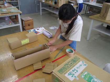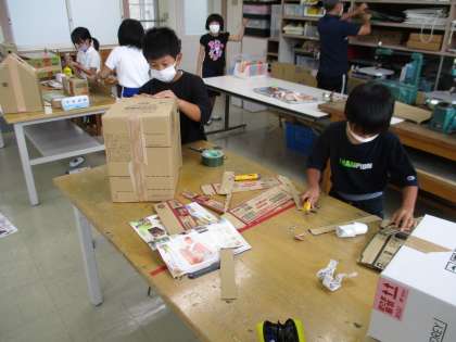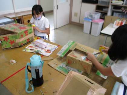 4年生の図工の授業の様子です。段ボール箱を使って「おもしろボックス」を作っていました。段ボールの箱に穴をあけたり、段ボールを切って飾りつけをしたりと、いろいろ工夫する姿が見られました。どんな作品が出来上がるか楽しみです。