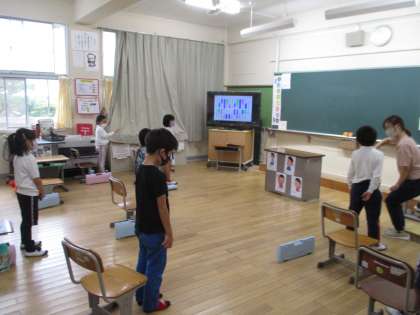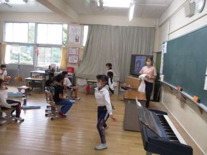 1・2年生の音楽の授業の様子です。リズムに乗って体を動かしたりダンスしたりする活動をした後、鍵盤ハーモニカの練習をしていました。みんなとても楽しそうに取り組んでいました。