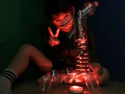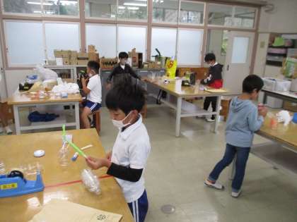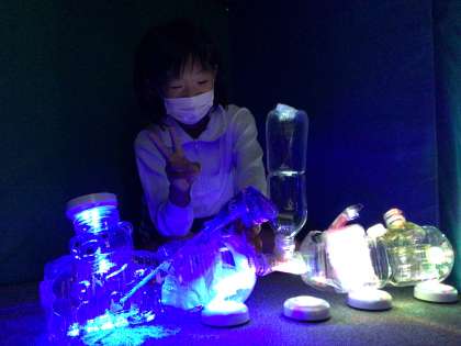 3年生の図工の授業の様子です。「クリスタルアニマル」というペットボトルで動物を作ってLEDライトの上に乗せて光らせるという作品を作っていました。完成した作品を光らせると幻想的でとてもきれいでした。