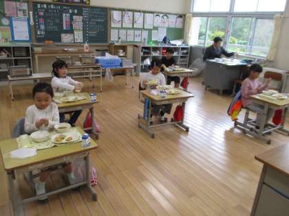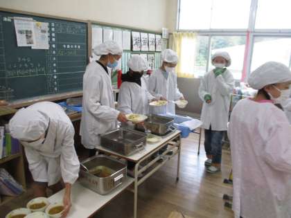 今日は前期最後の給食でした。今日の献立は「むぎごはん、カレー、いかナゲット、サワーキャベツ、牛乳」でした。いつも通り協力して配膳し、おいしくいただきました。
