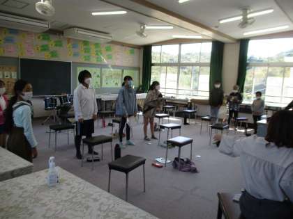 1年生の書き方、3年生の算数、5・6年生の音楽の授業の様子です。1年生は、みんなとても上手に文字を書くことができていました。3年生は、1円玉を使って重さを比べていました。5・6年生は、自分たちの歌声を録音してハーモニーを確かめていました。
