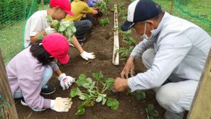 3年生が学校の畑にいちごの苗を植えました。初めに草取りをして畝を整えた後、いつもお世話になっている地域講師の方から苗の上方のコツを教えてもらい、みんなで協力して植えました。いちごが大きくなって収穫できる日が待ち遠しいですね。