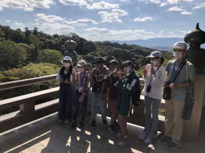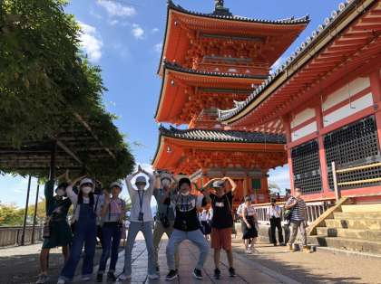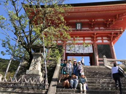 清水寺の様子です。三重塔の前と舞台の上で写真を撮りました。晴れて暑いぐらいです。