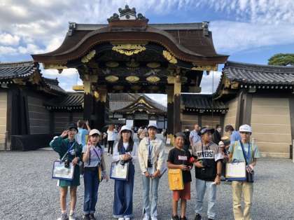 二条城に着きました。豪華な唐門の前で写真を撮り、二の丸内の見学をしました。鶯張り廊下がキュキュっと鳴ることを実感したり、豪華な襖絵を見て感動したりするなど、学びの多い時間となりました。みんな元気です。今から最後の見学地の金閣寺に向かいます。