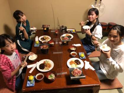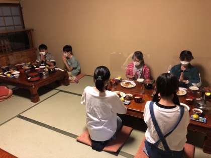 夕食の時間です。ハンバーグやお肉やポテトなどのご飯をおいしくいただきました。ご飯をおかわりする子もいて、みんなとても元気いっぱいです。この後は、夜の散策に出かけます。
