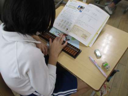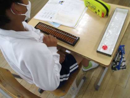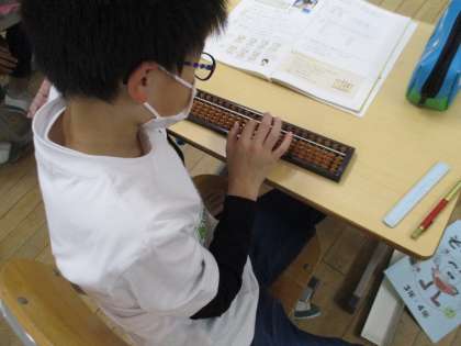 4年生の算数の授業の様子です。そろばんの練習をしていました。普段使っていないそろばんに苦戦していましたが、慣れてくると素早く計算できるようになってきました。