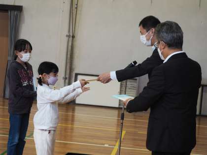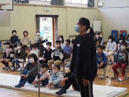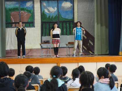 全校児童と御作こども園の園児が交通安全集会に参加しました。はじめに交通安全標語の優秀者の表彰を行い、2人の児童に賞状と賞品を渡しました。その後、劇団『笑劇波』による交通安全劇を見ました。劇を通して、自転車に乗るときは「ブ・タ・ハ・ラ」を確認するなど、楽しみながら交通安全について学ぶことができました。