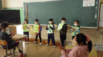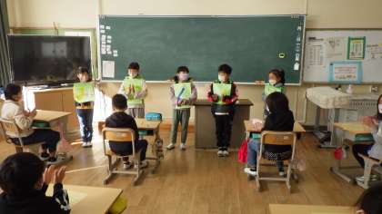 2年生の「みつくりもりあげ隊」が、4・5・6年生の誕生日の子たちをお祝いするために、各教室を訪問しました。2年生の子たちが一生懸命お祝いのメッセージを伝えると、お祝いされた子たちはみんな嬉しそうでした。2年生のおかげで「みんなが幸せになる学校」にまた一歩近づくことができました。