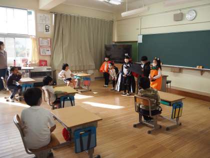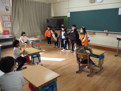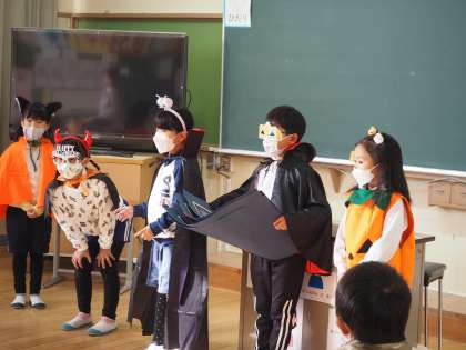 2年生が「みんなが幸せになる学校にするため作戦」の一つとして、各学級にハロウィンの掲示物をプレゼントしました。ハロウィンの変装をした子どもたちは「ハッピーハロウィン!」と元気に言いながら自分たちが作ったハロウィンの掲示物を渡していきました。2年生のおかげで、学校中に笑顔があふれていました。