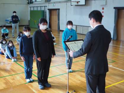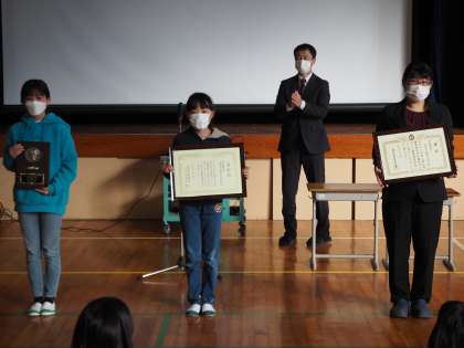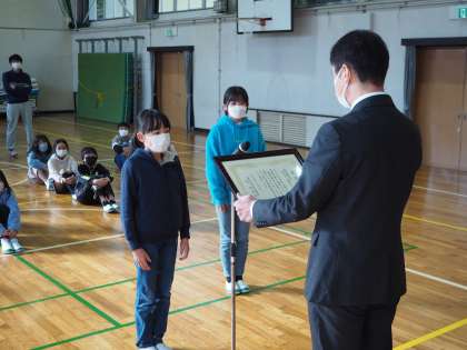 御作小学校が「令和4年度愛知県健康推進学校 特別優秀校」に選ばれ、愛知県教育委員会から表彰されました。代表で、養護教諭、前期と後期の健康いきいき委員長が校長先生から賞状と盾を受け取りました。学校での健康教育への取組と、家庭での健康教育へのご協力が実を結び、このような素晴らしい賞をいただけたのだと思います。これからも、健康教育への取り組みを進めていきたいと思います。