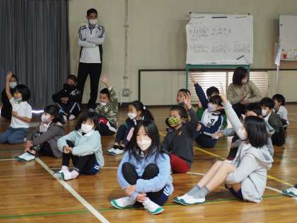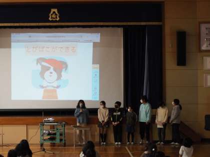 月曜日に児童集会が行われ、5年生が英語でクイズを出す企画をしてくれました。「I can swim.」など、ヒントを英語で出しながら、6年生の誰のことかを当てるという内容でした。答えが見えてしまうハプニングもありましたが、5年生のおかげで楽しい時間となりました。