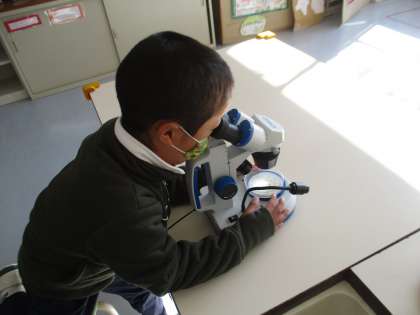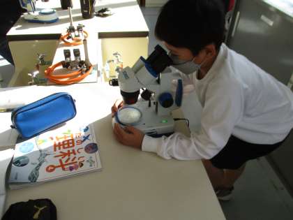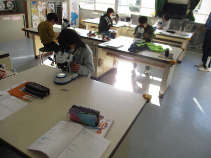 3年生の理科の授業の様子です。グラウンドの砂や小石を顕微鏡で拡大して観察していました。子どもたちからは「よく見える」「すごいきれい」という感想が聞かれました。
