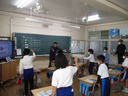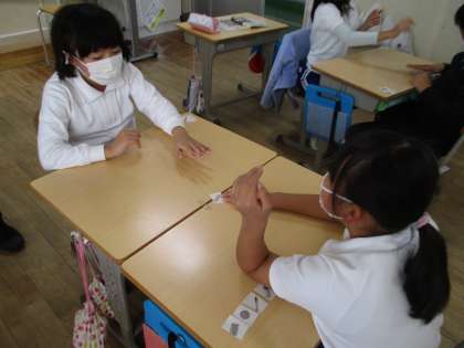 4年生の外国語活動の様子です。ALTの発音を聞いて、当てはまる単語のカードを取る学習をしていました。最後の1枚はどちらの子が取れたでしょうか。楽しく英語の勉強ができました。