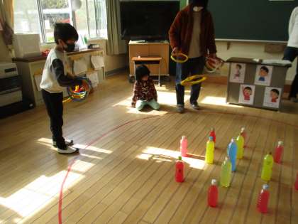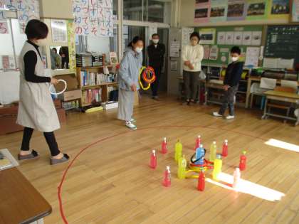 輪投げの様子です。ライン外から輪を投げ、真ん中の青色のピンに入れば3点です。係の方の注意を聞いた後、順番に輪を投げていきました。みんな3点のピンを中心に高得点を狙っていました。