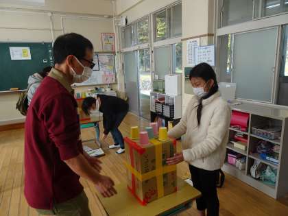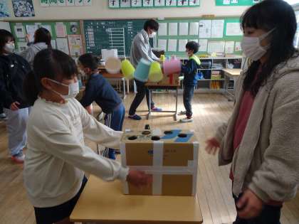 次は、段ボールロケットキャッチゲームです。段ボールの側面をたたき、段ボールの上に置いた紙コップがロケットのように上にあがったところを落とさずにキャッチするというものです。段ボールを強くたたきすぎると紙コップが高く上がりすぎ、弱すぎると紙コップが上がらずにうまくキャッチできません。中には、5つ全部キャッチできたプロフェッショナルな親子もいました。