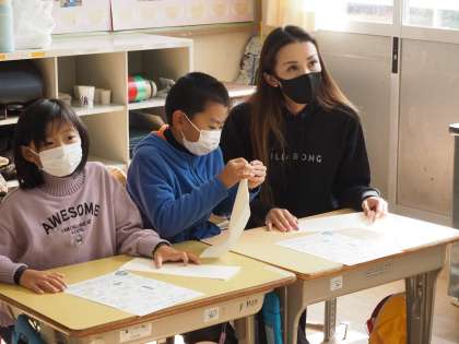 次は、紙飛行機飛ばしで使う紙飛行機作りです。ギネス記録(69.14メートル)を出した紙飛行機の作り方を見ながら、親子でそれぞれの紙飛行機を作りました。