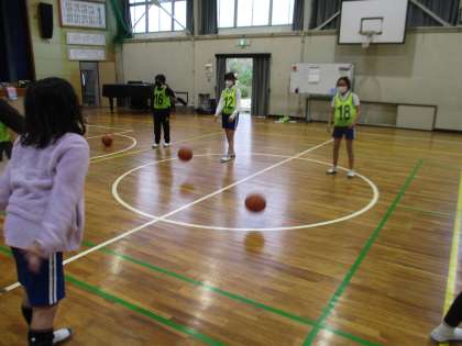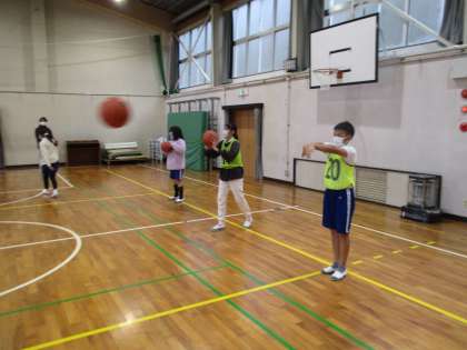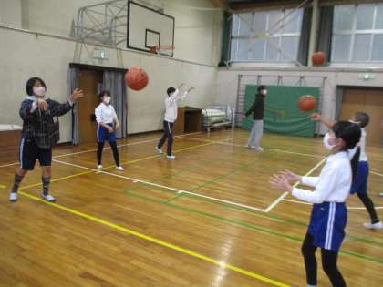 5・6年生の体育の授業の様子です。バスケットボールで、パス交換の練習をしていました。