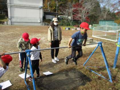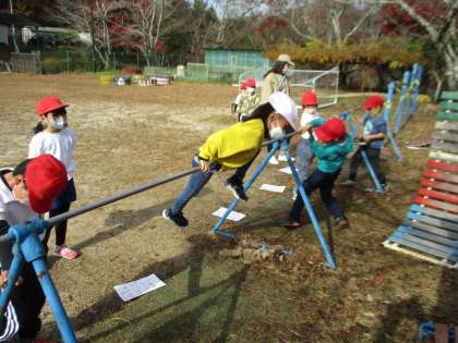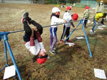 1・2年生の体育の授業の様子です。いろいろな鉄棒の技にチャレンジしていました。
