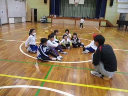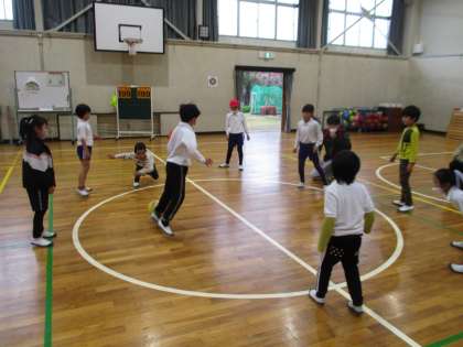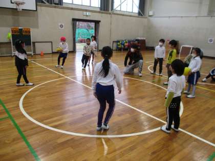 1・2年生の体育の授業の様子です。転がしドッジボールに取り組んでいました。