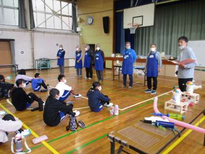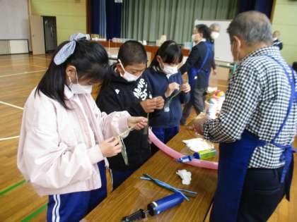 ものづくりサポートセンターから7名の講師の方を招き、5・6年生が科学の体験学習を行いました。初めに、静電気の性質を使った体験をしました。