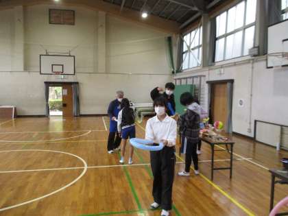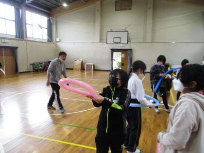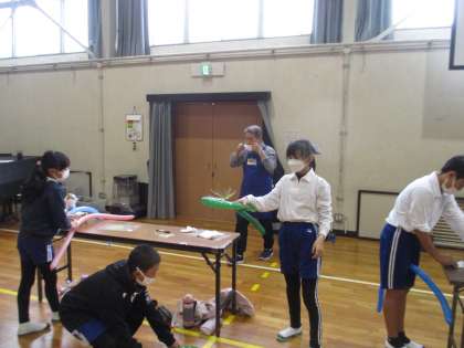 ビニルロープを割いてクラゲのようにしたものを紙でこすって静電気を発生させ、同じく紙でこすって静電気を発生させたゴム風船を近づけるとお互いが反発し合ってビニルロープが空中を舞うという体験をしました。なかなかうまく反発し合わず、逆にお互いがくっついてしまうという子が多かったです。