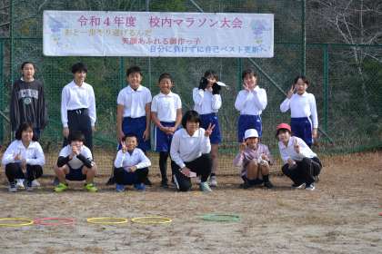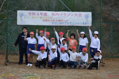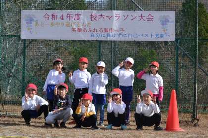 1・2年、3・4年、5・6年の集合写真です。みんないい笑顔です。マラソン大会みんなよく頑張りました。