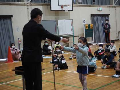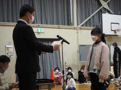 初めに表彰を行いました。社会を明るくする運動作文コンテストと科学研究作品の入賞児童に、校長先生が賞状と賞品を渡しました。