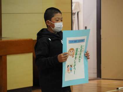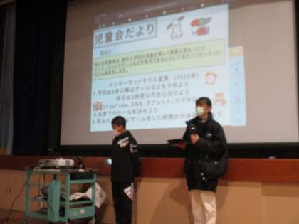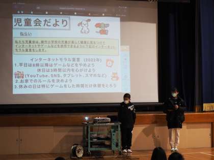 次に、児童会が令和5年度の「インターネット・モラル宣言」を行いました。この宣言をもとに、各家庭でのルールを作成していただきます。子どもたちが適切にインターネットやゲーム等に関われるよう、ご家庭のご協力をよろしくお願いします。最後に、今月のめあてを伝えて集会を終えました。