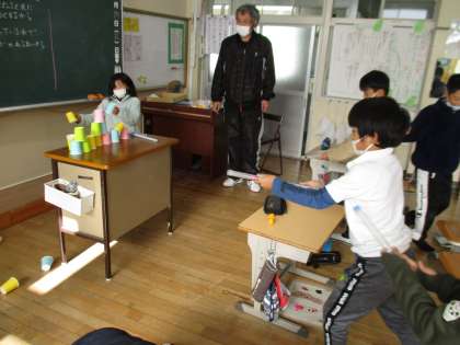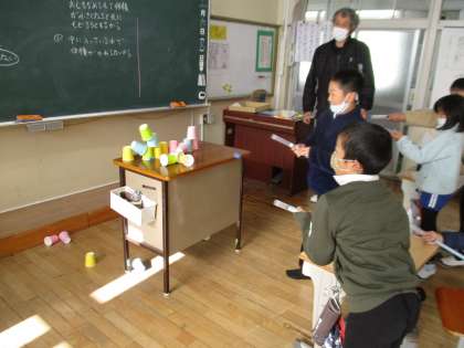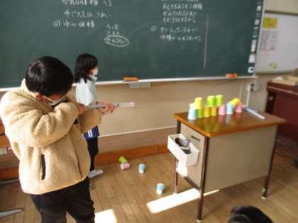 3年生の理科の授業の様子です。空気鉄砲を使って的当てをしながら、空気の力について学んでいました。