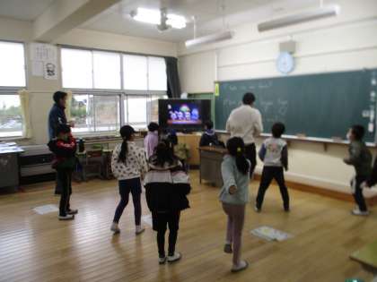 Eタイムの様子です。映像に合わせて楽しく歌ったり踊ったりしながら英語に親しんでいました。