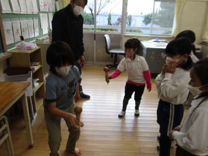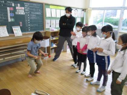 けん玉名人の4年生と2年生がけん玉で交流しました。4年生の子のスペシャルな技に2年生の子たちは「すごい」と驚いていました。