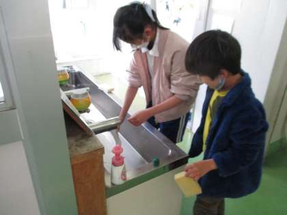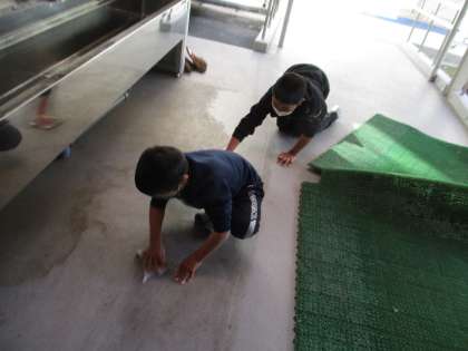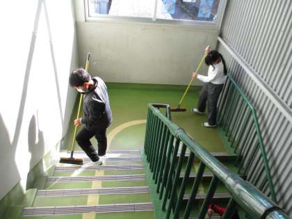 縦割り掃除の様子です。上の学年の子が下の学年の子に教えながら協力して掃除をしています。自分たちが生活する学校を自分たちできれいにしようと頑張ってくれています。