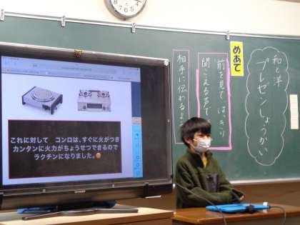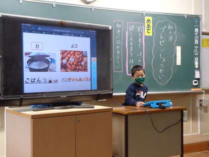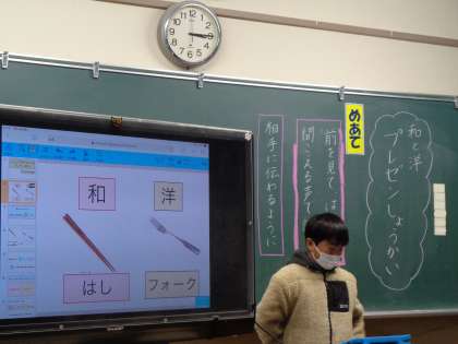 3年生が国語「くらしの中の和と洋」の学習のまとめとして、自分たちが選んだ和と洋のものをタブレットを使ってまとめ、先生たちに発表するという授業を行いました。